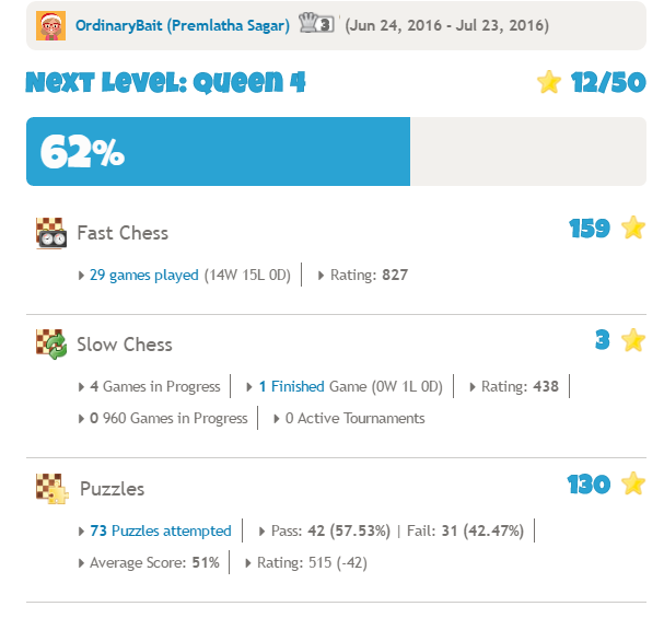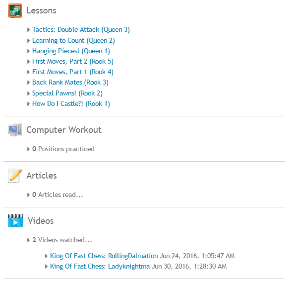 Chesskid.com allows you to view Report Cards of each student, that show you a detailed report of a students progress. The report includes fast chess, slow chess and puzzle progress, as well as lessons and computer workouts attempted, videos watched and articles read. See below for an overview of one of our chesskid student's report card at ZugZwang. You can find an example below:
